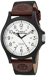 Adjustable black & brown 20 millimeter genuine leather and fabric strap fits up to 8-inch wrist circumference Black dial with full Arabic numerals; Date window at 3 o'clock; 24-hour military time Durable black 40 millimeter resin case with acrylic crystal Indiglo light-up watch dial; Luminous hands Water resistant to 50 meter (165 feet): In general, suitable for short periods of recreational swimming, but not diving or snorkeling