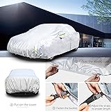 The car cover fits sedans with length between 171 and 180 inches (457 cm) , like 2016-2023 Toyota Prius, 2020-2021 NISSAN Versa, 2015-2020 HYUNDAI Elantra etc. Protects your car against outdoor elements, like damaging UV rays, dust, dirt, wind, snow, ice, and tree debris Made of marine-grade 150D polyester Oxford for superior strength and tear resistance over typical 190T polyester; Silver coating reflects harmful UV rays to protect your car's interior from sun damage. Sewn-in elastic band (front and rear of the cover) ensures a snug fit; fastening straps with adjustable buckles (front, middle and rear of the cover) ensure extra-secure placement, even on windy days 2 mirror pockets for optimal coverage; door zipper for easy in/out access on the driver’s-seat side; 6 reflective stripes for clear visibility after dark NOTE: Only a cover that is longer than your sedan fit your sedan, this cover is 180 inch long; Not compatible with vans, SUVs, hatchbacks, or sports cars with long hoods.