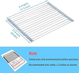 OVER THE SINK DRYING RACK : We have 5 different sizes for your option: 17.5(L) x 11.8(W) , 17.5(L) x 15.7(W), 17(L) x 13.7(W) , 20.5(L) x 13.7(W),17(L) x 11.8(W).Suitable for most kitchen sinks and counter. This over the sink dish drainer drying rack is 17.5(L) x 11.8(W) inch fits sink not wider than 16.5".Please check your sink measurements and choose the right size before purchasing the roll up dish drying rack over sink!A great addition to kitchen accessories and apartment necessities.Great kitchen gadgets for a tidy kitchen. HIGH QUALITY : Made of 304 Stainless Steel with sturdy construction, the collapsible cutting board over sink is sturdy, rust resistant,non-slip, waterproof; support up to 33lbs, not easy to bend or twist by heavy cookware. A great portable stainless steel rolling rack for apartment essentials and home accessories. MULTI-PURPOSE: This folding sink dish drying rack not only can be used as a dish drainer for air-drying kitchenware, such as washed bowls, pans, glasses, cups, plates, cookware, cutlery, saucepan, mugs; but also as a vegetable colander for fruit and veggie wash; or as a non-slip trivet mat for hot pots or bakeware on countertop. The dish drying mat can also be used as a kitchen sink caddy, sink cover, camping sink mat, sponge holder, over the sink colander, kitchen sink organizer for RV storage. SPACE SAVING : The rollable kitchen drying rack is designed with 15 stainless steel tubes, fixed firmly by silicone, which makes it easy to use, lay flat, clean or put away for storing in cabinet when not in use, saving your counter space. This dish drying rack over the sink adjustable design frees up much counter space then traditional dish drainer. Perfect for house organization and storage. Great gifts for your parents, families, friends and perfect house warming gifts for new home. FOOD SAFE AND HEAT RESISTANT : The dish draining rack with food safe grade silicone coated is heat resistant up to 400°F (204°C), BPA-free, dishwasher safe. As a perfect trivet for cooling down hot pans from oven or stovetop, or thawing frozen articles from refrigerator. Satisfaction guarantee. Any issue with this drying rack for sink organizers and storage, please contact us FIRST on order detail page before any return.