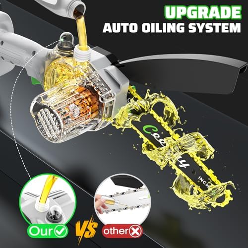- ✔【Auto Oil Filling System】The Ceepuy mini cordless chainsaw features an Auto Oil Filling System, compatible with all brands of oil. Fill the tank with oil, and with a simple press, you can effortlessly lubricate the chain, This system not only reduces wear and tear for smoother cutting, but also increases the number of cuts with less energy use. A single oil fill lasts all day, eliminating the need to carry around a heavy bottle of lubricating oil!