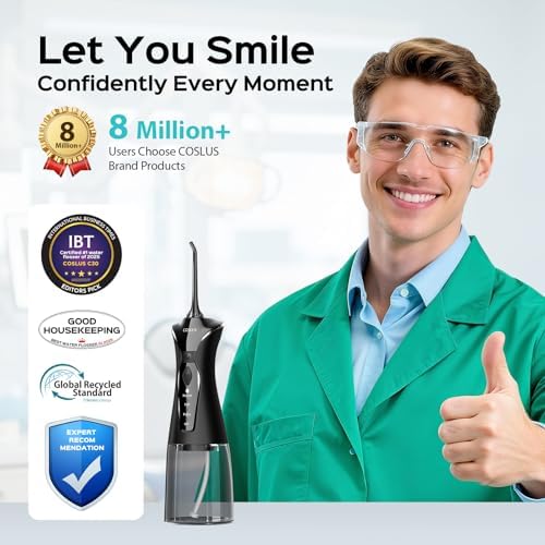 - Gentle Oral Care with Precision Clean: After 5 years of R&D by the COSLUS team, we present a certified, superior water flosser pick, the wireless flosser can offer 1400-1800 dual-pulse streams/min and 30-150PSI adjustable strong water pressure for dental plaque removal. Gum sensitive flosser with 4 multi-functional nozzles, easily removes food debris trapped between braces, meanwhile meets the comprehensive oral care of teeth, gums and tongue can effectively solve and supports oral health by targeting common concerns