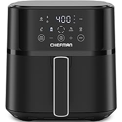 FAST AND EASY: This compact air fryer handles any culinary challenge. Customize cooking time and temperature with the digital touch screen display or use one of four preset functions for quick, one-touch meals. Perfect for serving 3-5 people 450°F HI-FRY TECHNOLOGY: Achieve the perfect finishing crunch on your air-fried favorites. Increase the heat to 450°F during the final two minutes of cooking: perfect for extra crispy chicken tenders and French fries. STYLISH AND COMPACT: The sleek, narrow design of this air fryers maximizes its 6-quart capacity while minimizing its countertop footprint. Its compact size makes it a great space saver, fitting perfectly on your counter or in your cabinets HEALTHY COOKING: Enjoy delicious meals with little-to-no oil. This Chefman large air fryer lets you cook healthier, low-fat meals that still taste amazing LED SHAKE NOTIFICATIONS: Get notified with an audible alarm halfway through cooking, reminding you to shake your food for the crispiest results possible SIMPLE CLEAN-UP: The 6-quart nonstick basket and rack are both dishwasher safe, making clean-up quick and easy. The stylish matte-black finish is timeless and easy to wipe clean with a damp cloth SAFETY FIRST: With automatic shutoff technology, this air fryer ensures added safety by turning off when cooking is finished or when the basket is removed TRUSTED QUALITY: This air fryer is cETL approved with advanced safety technology for long-lasting durability and comes with a 1-year assurance provided by Chefman. 1700W/120V – RJ38-6T-BLACK