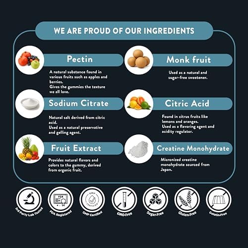 - Ingredients: Our creatine monohydrate gummies stand out because of our commitment to clean ingredients, ensuring that every aspect of your creatine intake is pure and natural. Crafted with transparent ingredients, our gummies offer a wholesome alternative to conventional creatine powder. Free from artificial additives, pesticides, and GMOs, our creatine gummies prioritize your health and well-being. With each chew, you can trust that you're fueling your body with the highest quality ingredients, sourced sustainably and responsibly. Join us in embracing the difference and elevate your fitness journey with our premium creatine monohydrate gummies.