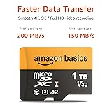 1TB Micro SD Card compatible with smartphones, tablets, cameras, GoPro/action cameras, laptops, desktop computers, DSLRs, drones, gaming consoles and more. This Micro SD card is not compatible with the Nintendo Switch 2 Ideal for recording and storing Full HD/4K/5K videos, high resolution photos, and other data types Read speed up to 200MB/s. Write speed up to 150MB/s. For optimal smartphone experience includes UHS-I, U3, Class 10 and A2 speed classes. Note: to achieve 200MB/s read speeds (above UHS-I) this Micro SD Card needs Amazon Basics Micro SD Card Reader USB C 3.0 B0DB4YQPL1 (sold separately). Shockproof, IPX6 waterproof, temperature-proof (-10° to 80°), X-Ray-proof, and magnetic-proof Note: Actual storage capacity shown by different Operating Systems may be less than the capacity indicated on the product label due to different measurement standards. The available storage capacity is higher than 908GB. Read and write speeds are based on internal tests conducted under controlled conditions. Actual speeds may vary depending on the device used, interface, conditions of use, and other factors. Check whether your device is compatible with the microSD capacity; for example, if the device only supports a maximum capacity of 64GB, it may not recognize this Micro SD Cards’ full capacity of 1TB. What you get: One Micro SD Memory Cards, One MicroSD Adapter, Quick Setup Guide. Note: The Micro SD Card Reader USB-C 3.0 (B0DB4YQPL1) not include, sold separately.