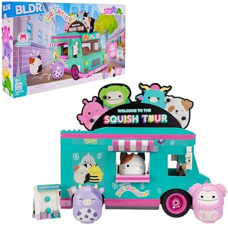 Hit the open road with Cam, Bubba, & Brina! This Squishmallows buildable display set is authentically modeled after the iconic Squish Tour Van and features a fully-detailed lux interior. Play or display the included Squishmallows buildable figures Cam, Bubba, & Brina—featuring squishable bellies powered by SquishBrik by Original Squishmallows—sitting in one of four van seats, bumping to the stereo system in the rear, or waving to fans from the side awning or door that swings open. BLDR bricks are compatible with all major construction brands, ensuring endless possibilities for creativity. Join the Squishmallows Squad with this exciting display set—perfect for kids and fans who love to build, imagine, and play!