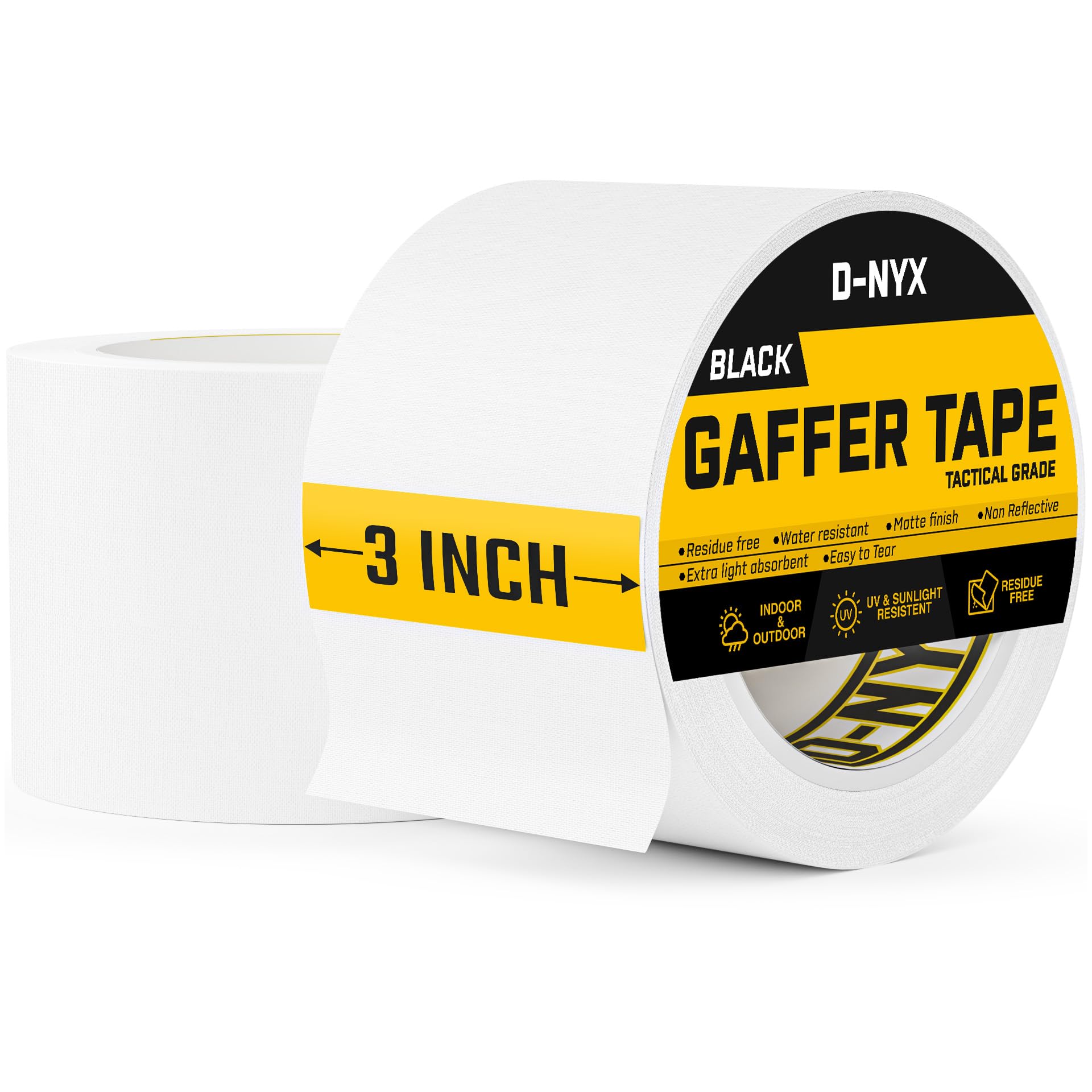 STURDY AND SECURE SETUPS: Perfect for event setups, our 1.88 inch gaffing tape firmly anchors cables, props, and equipment with unbeatable hold. Easy to tear, residue-free, and built tough - it’s the backstage essential for seamless execution. STRONG GRIP, NO RESIDUE: DNYX Premium black gaffer tape forms an unshakable bond when applied, yet leaves no residue when removed. Perfect for delicate surfaces and expensive equipment, it protects while maintaining flawless finishes. The professional's choice for temporary installations that demand perfection. DNYX CONFIDENCE: Engineered for professional-grade performance, our heavy-duty gaffer tape delivers unbeatable hold for cables, equipment, and stage setups. Each pack contains 1 roll of 1.88 inch matte black tape, built to withstand the rigors of live events, film sets, and photo shoots. For optimal adhesion, apply to clean, dry, smooth surfaces - resisting dust, grease, and environmental wear. The go-to choice when failure isn’t an option. A MUST-HAVE FOR EVERY TOOLKIT: Versatile and reliable, use it to anchor computer, TV, or other cables securely to the floor, keeping them tidy and hazard-free. Block drafts by sealing doors and windows, or tackle repairs on boats, cars, and beyond. With endless practical uses, DNYX Gaffer Tape is the ultimate problem-solving companion! EFFORTLESS APPLICATION: Our 2-inch matte black gaffer tape applies smoothly and tears cleanly by hand for perfect sizing every time. Get a custom fit for any task, with no sticky residue left behind. Ideal for professional-grade holds and clean removals - strong when you need it, clean when you're done!
