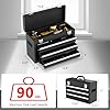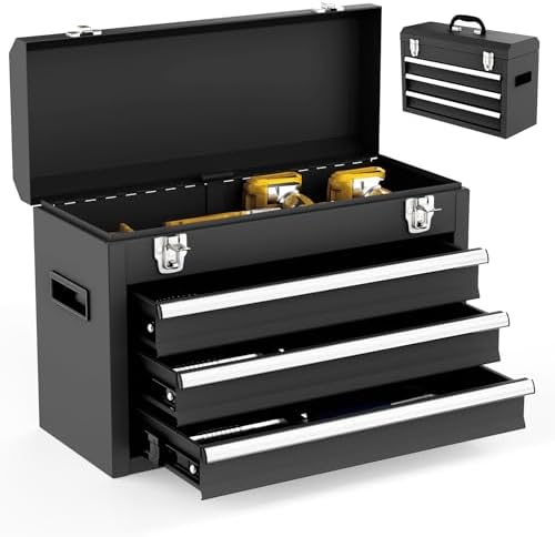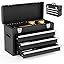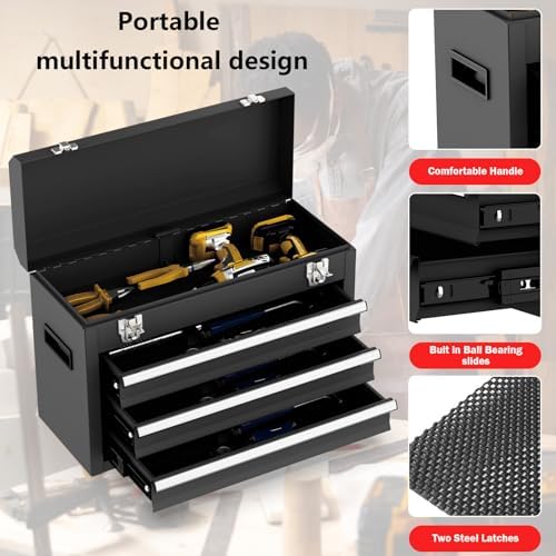 3 Drawer Metal Tool Box, Portable Metal Tool Box with EVC Liners and Latches Closure, Heavy Duty Steel Tool Chest with Ball Bearing Opening and Powder Coated Finish, Black