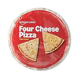 One 14.75-ounce package of Frozen Four Cheese Thin Crust Pizza Keep frozen Made with real cheese Topped with mozzarella, provolone, fontina, and asiago cheeses Contains: Milk, Soy, Wheat With Amazon Saver, you’ll find affordable staples without the frills. Our essentials will help your grocery budget go further Shop smarter with Amazon Saver