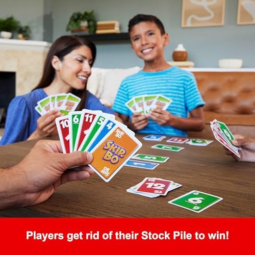 Skip-Bo is the sequencing card game from the makers of UNO game that's easy to learn and all kinds of fun Players use skill and strategy to create stacks of sequentially numbered, ascending cards (2,3,4) until they have no more left to play. The first player to deplete their stockpile wins. Skip-Bo Cards are wild and mix up the action -players should use them wisely. Bring Skip-Bo along on game night and pile on the fun Includes 162 cards and instructions. Designed for 2 to 6 players ages 7 years old and up. Colors and decorations may vary.