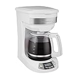 WAKE-UP READY COFFEE WITH EASY-TOUCH PROGRAMMING: It's simple to program the drip coffee maker and clock. Set the white coffee maker up to 24 hours ahead so hot coffee is ready in the morning when you wake up. GET YOUR FIRST CUP FAST WITH AUTO PAUSE & POUR: The Auto Pause & Pour feature lets you get your first cup fast. It briefly delays the flow of coffee so you can sneak a cup before brewing stops without making a mess. COFFEE YOUR WAY WITH SELECT-A-BREW: Control the strength of your coffee with Select-a-Brew's regular and bold brewing options. The 1-4 cup brewing option ensures the best flavor when brewing smaller servings. PEACE OF MIND WITH 2 HOUR AUTO SHUTOFF: After brewing, the Hamilton Beach coffee maker keeps coffee warm for 2 hours, then it automatically shuts off. DURABLE AND EASY TO CLEAN: The 12 cup borosilicate glass carafe and removable brew basket on this programmable coffee maker are dishwasher safe for fast, easy cleanup.