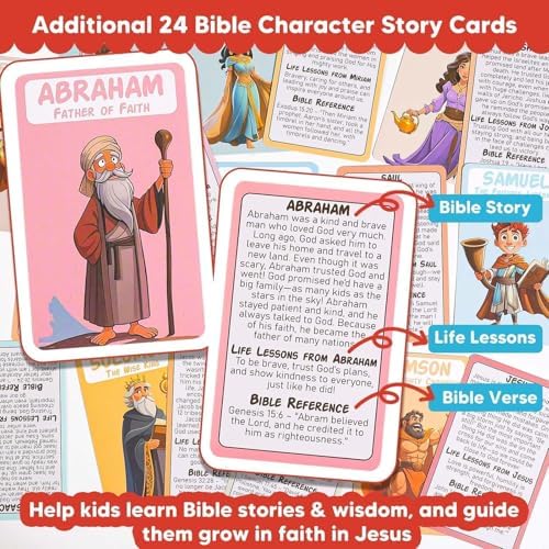 - Foster Faith Growth: This is a Bible bingo game with 24 classic Holy Bible characters (96 cards, including Jesus, Adam, Eve, Mary, and others), along with an additional 24 corresponding cards that tell their life stories. These Bible stories offer timeless lessons—teaching kids how to walk in faith, make wise choices, and trust God through different seasons of life. Kids will discover the values of courage, kindness, obedience, and perseverance, and be inspired by the Lord’s guidance in their own journeys